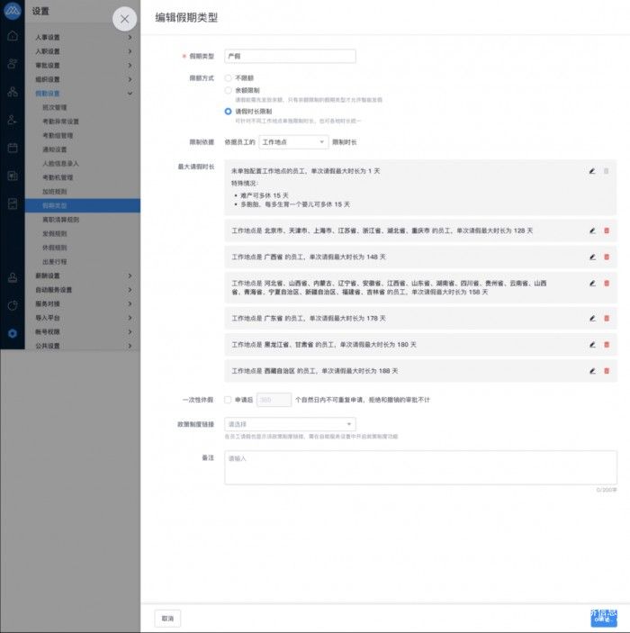 针对“法定一次性休假”,也能提前设置好休假规则,HR可针对不同假期进行自动管控,释放零碎的时间和精力。