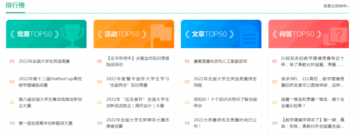 (“赛氪”平台的竞赛、活动、文章、问答TOP50排行榜)