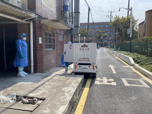 本轮疫情发生以后,行深智能得知闵行区江川路街道的物资运输困难后,迅速响应,派出防疫无人送餐车,投入到疫情防控物资无人配送工作中。