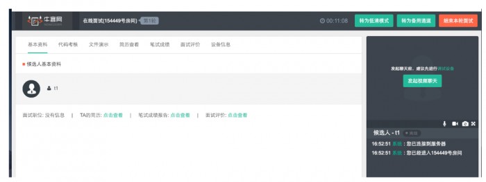 牛客网是一家专注于技术类人才招聘的一站式平台,Moka与牛客网视频面试功能进行有效连接,可由Moka跳转至牛客网面试平台,对技术类岗位进行个性化的面试+在线笔试。视频面试时,支持面试官同时查看候选人简历、及笔试成绩,方便面试官根据面试者个人资料进行考察提问,针对技术型岗位,面试时可以进行代码考核,文件演示,以及填写最终的面试评价。