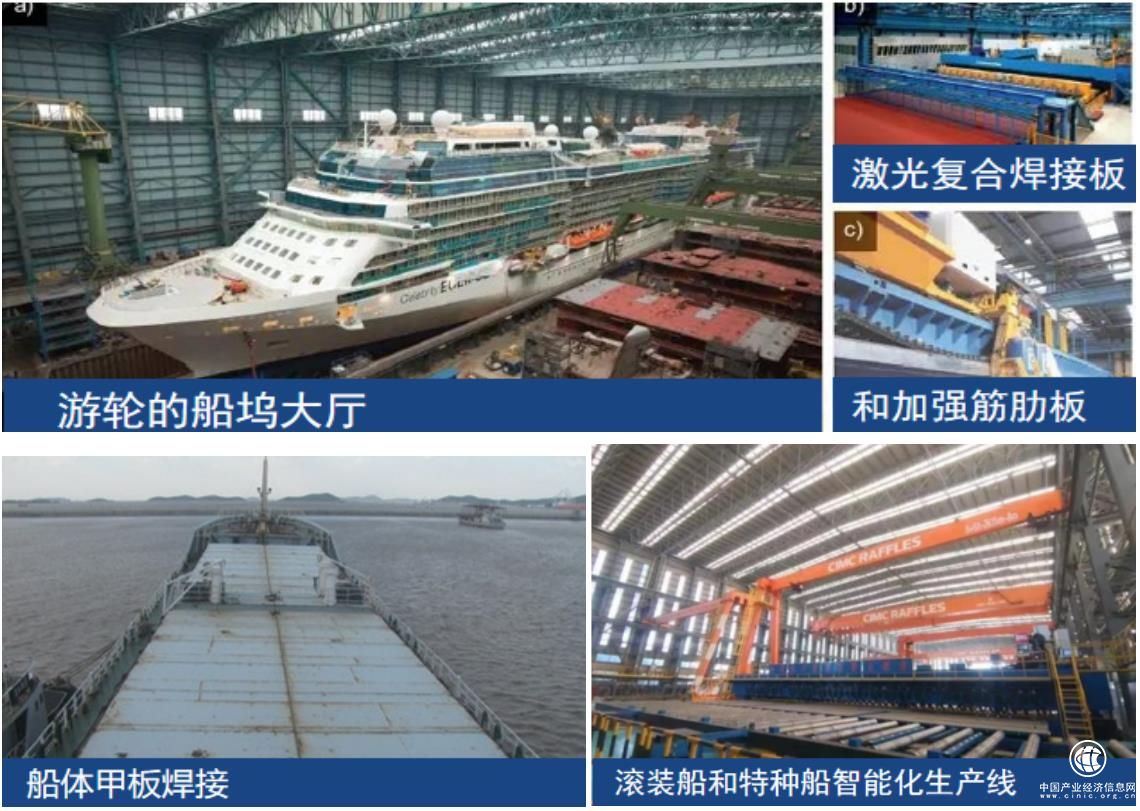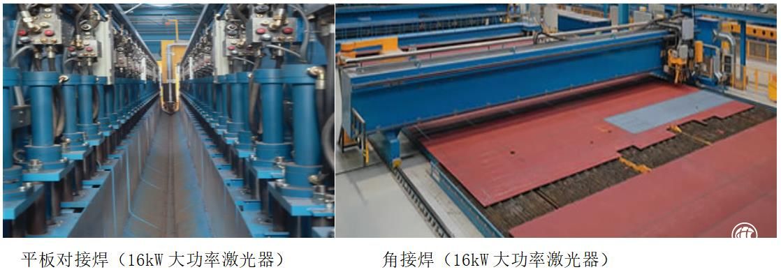 当前,欧美国家已经在游轮、滚装船和特种船等民用船舶的智能制造过程大量采用激光焊接技术。下图展示了激光复合焊接板生产线、加强筋板生产线、滚装船和特种船钢板平面对接生产线,从船体甲板焊接图中我们可以明显看到长边和短边的连接焊接。