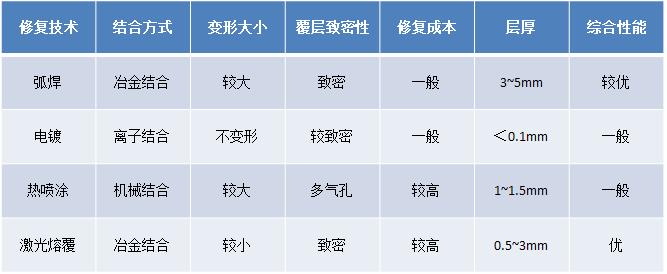 传统的修复工艺主要有普通焊条堆焊、喷涂和电镀等,但它们存在形变大、修复厚度有限、涂层容易脱落等缺点。而对比来看,激光熔覆技术优势显著,主要包括:①激光熔覆时可对基体产生较小的热影响区,工件变形较小;②熔覆层与基体材料之间可实现冶金结合,且熔覆材料稀释率较低;③熔覆层晶粒细小、结构致密,能够获得较高的硬度和耐磨、抗腐蚀等性能;④可以做到选择性局部细微修复,有效降低修复成本;⑤粉末材料体系适应性比较高,大多数的常规及特种金属粉末材料都可熔覆到金属零件表面。