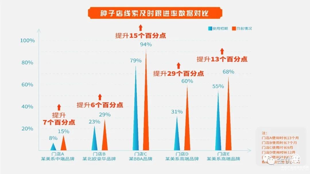 在车百灵之钣喷管家试运营阶段,我们合作了多家种子店进行长时间耕耘,从反馈数据看,使用了车百灵之钣喷管家后,五家4S店的线索及时跟进率(5分钟内跟进线索)都有提升,使用效果最好的某美系高端品牌4S店门店D提升了29个百分点。