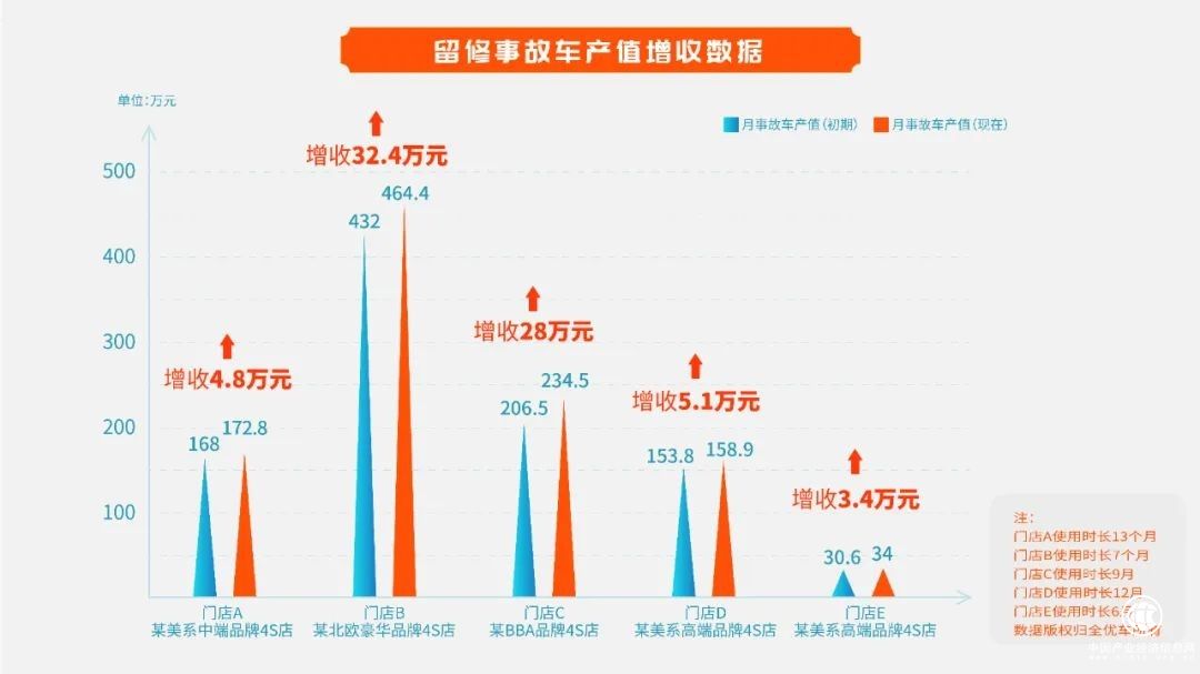 线索及时跟进给店内带来最直接的价值便是最终留修率的提升,从种子店的使用效果看,效果最好的门店E最终留修率提升了9个百分点。按照种子店线索的平均产值计算,在使用了车百灵之钣喷管家后,五家门店的留修收益提升了3.4万元到32.4万元不等。