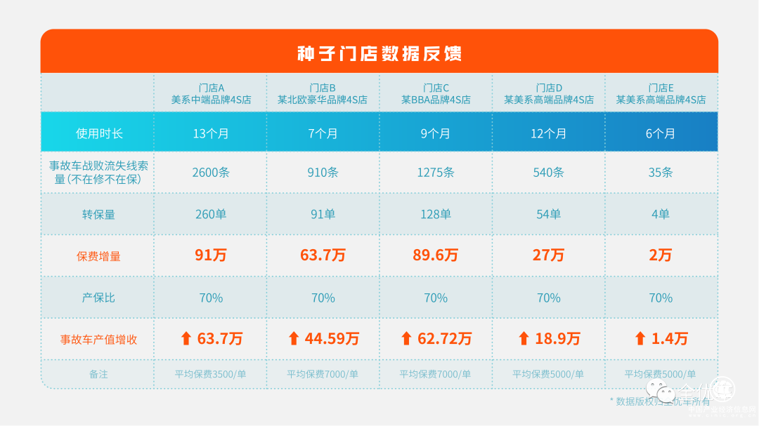从种子店反馈情况看,店内流失线索的转保率约10%。根据门店保单均价不同,五家门店通过车百灵之钣喷管家与车百灵之保险管家的融合获得的保费增收额不等,以70%产保比换算,事故车产值增收从1.4万元到63.7万元不等(具体事故车转保带来的增收额如下)。