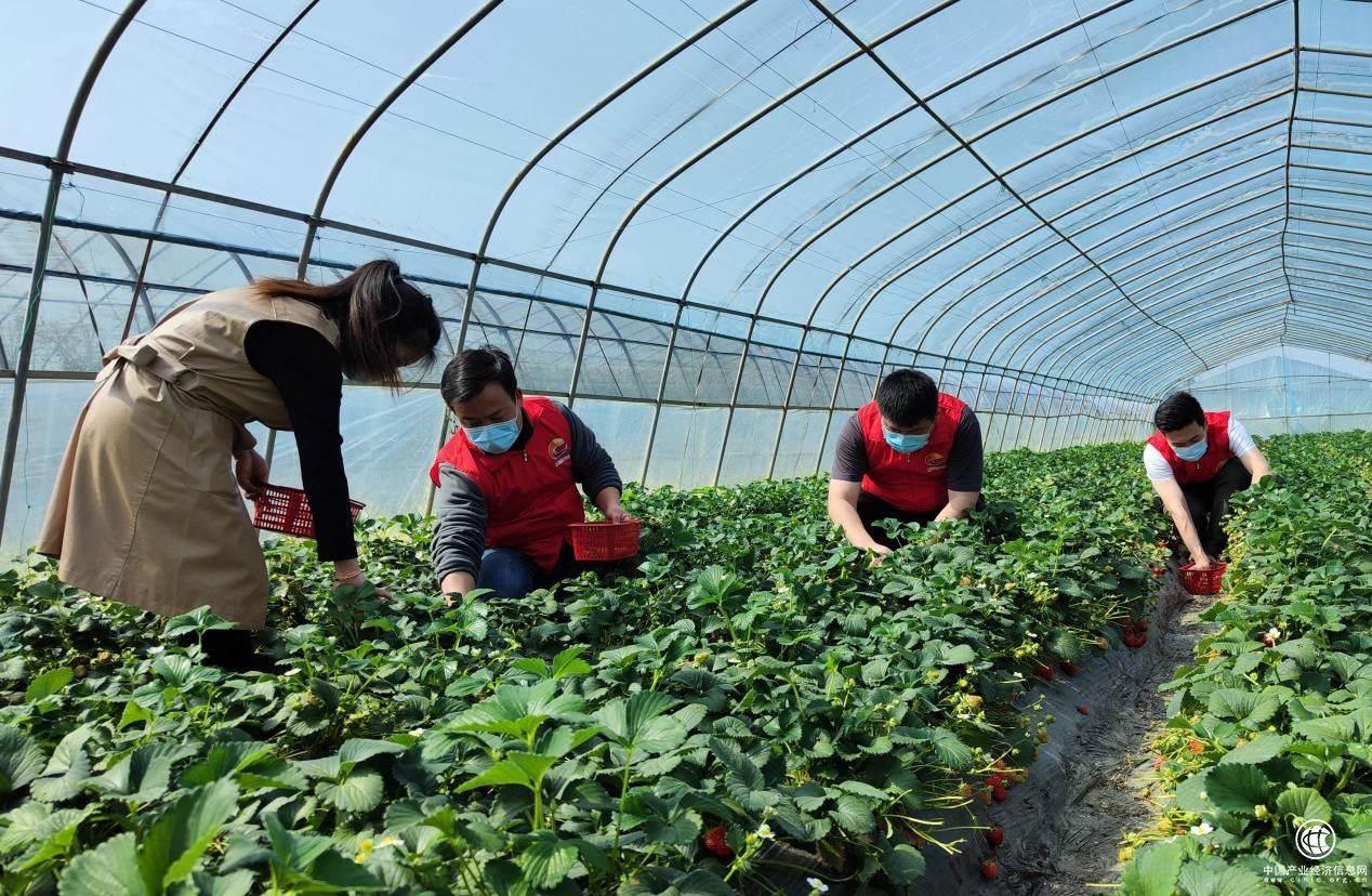 (图为:志愿者们在涂立春的草莓园里,帮助她采摘草莓。)