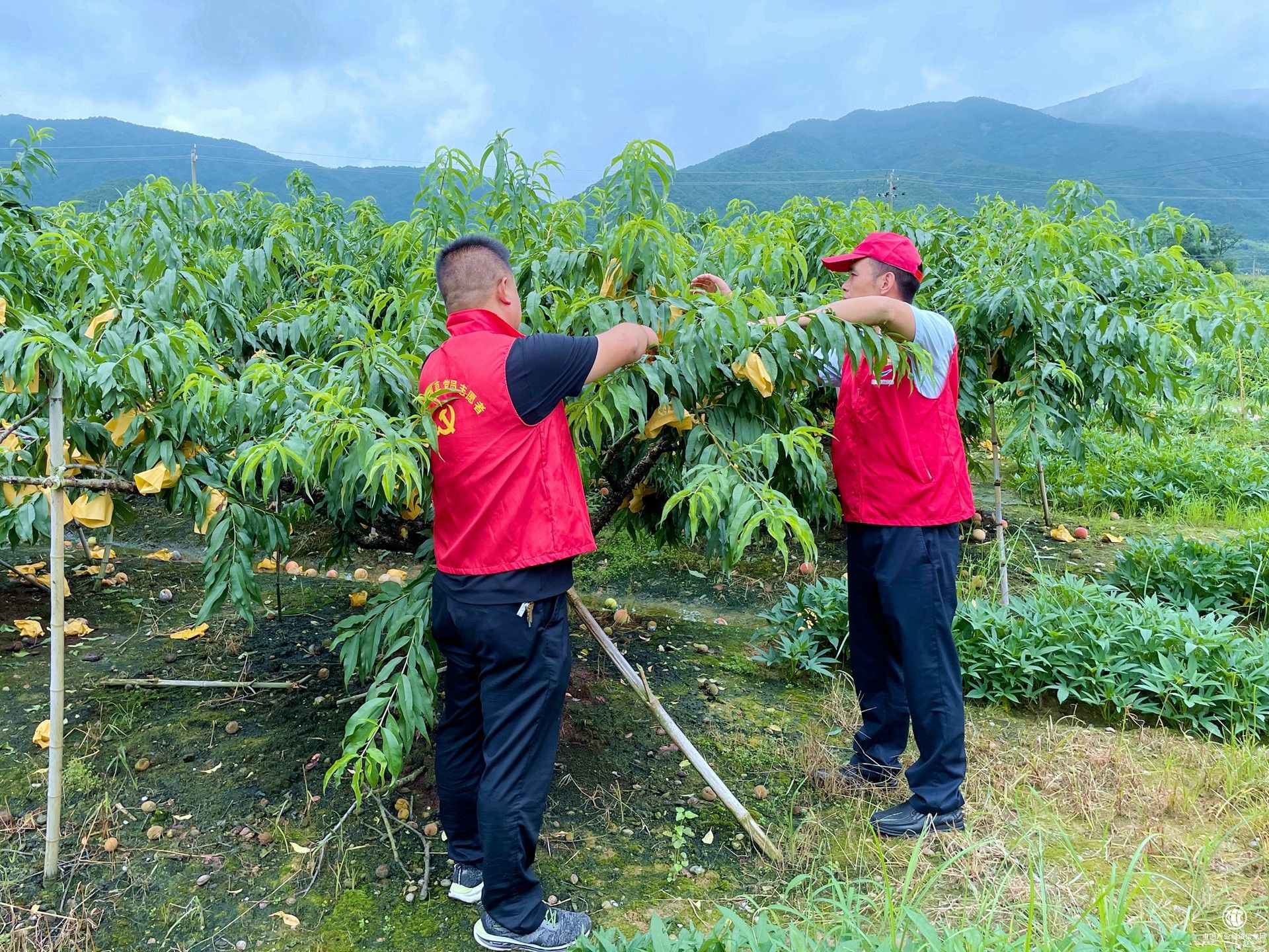 图为该局党员志愿者帮助果农采摘水果