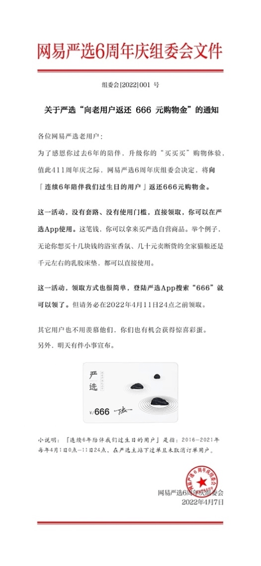 4月7日,网易严选官宣了本次6周年庆感恩老用户的活动。
