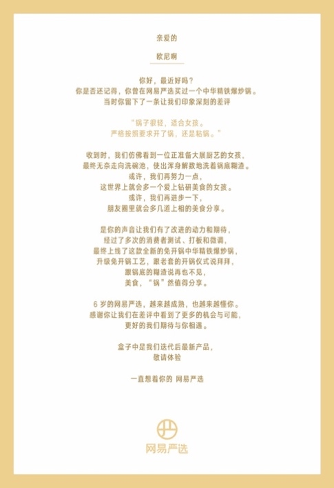 本次6周年庆,网易严选向曾经给严选留下差评的用户寄去了“100封求和信”,连同求和信一起寄去的神秘包裹,是根据该用户差评意见迭代后的商品。