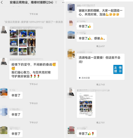 当各项工作有序开展,该物业经理和团队每天还会把防疫工作做成日报,同时发布在业主群里,让他们知悉小区的车辆管控、进出查验、社区消杀等具体进展。“感谢物业团队的坚守,你们辛苦了,加油!”封控期间,小区业主们纷纷对碧桂园服务的物业工作人员表示了感谢,赞赏他们逆行战“疫”的担当。