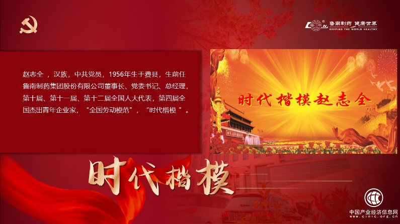前任鲁南制药集团股份有限公司董事长、党委书记、总经理赵志全同志从2万元贷款起步,用27年的时间把一个净资产不足20万元的小厂,建设成为一个净资产60亿元、年缴税9.2亿元、具有国际竞争力的现代化制药集团公司,为促进地方经济发展、带领群众脱贫致富作出了突出贡献。赵志全同志的无私付出令人动容,在2016年9月中宣部追授其“时代楷模”荣誉称号。