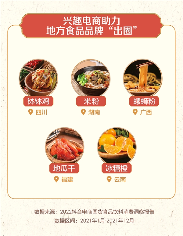 在兴趣电商助力下,越来越多地方国货食品品牌频繁“出圈”,受到消费者喜爱。4月11日,抖音电商发布的《2022国货食品饮料消费洞察报告》(下称“报告”)中显示,四川钵钵鸡、湖南米粉、广西螺蛳粉、福建地瓜干、云南冰糖橙等地方国货商品受到各地消费者认可。
