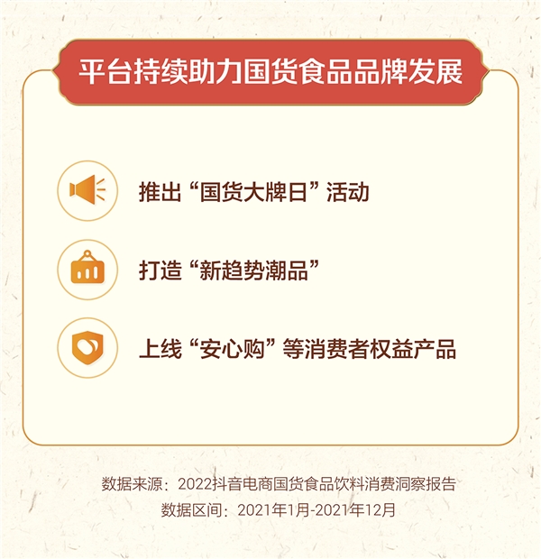 报告指出,抖音电商还将持续加大对国货食品品牌的扶持力度,落地多项品牌扶持措施。如抖音电商食品行业推出“国货大牌日”等扶持活动,设立大牌国货榜单等措施,联动国货大牌商家开设国货专场等,通过直播、短视频、互动道具等多种形式,将优质地方国货食品品牌展示在消费者眼前。