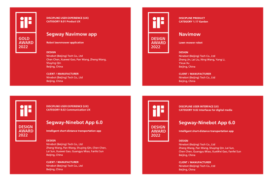 自1953年设立以来,iF设计奖已成为全球公认表彰优良设计的标志。该奖项面向全球设计师和制造商等征集优秀的建筑、产品、室内、包装、传达、服务以及专业概念设计。今年的评奖由来自20个国家/地区的132位设计专家进行最终的评选工作,透过全新的iF数位评选工具,从来自57个国家/地区的超过10,000件参赛作品中选出了进入2022年iF设计奖最终决选的参赛者。据了解,今年iF设计奖的参赛作品高达10776份,最终公布的金质奖获奖作品仅有73个,获奖率不足1%,可谓“史上含金量最高”,其中Segway Navimow App(赛格威割草机器人应用程序)就在金质奖榜单之中。