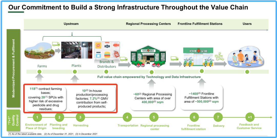 官方数据显示,盒马鲜生截至2021年7月已建成550余个农业直采基地和近140个盒马村,还在2020年4月启动了产业基地项目,计划今年投入使用,年处理水果14.6万吨、蔬菜21.9万吨、鲜肉10.95万吨;每日优鲜截至2021年9月也在全国拥有近200个“优鲜农场”直采基地;叮咚买菜截至2021年底已拥有3家农业示范园,签署了118家订单种植基地,并自建了10家食品研发加工厂。
