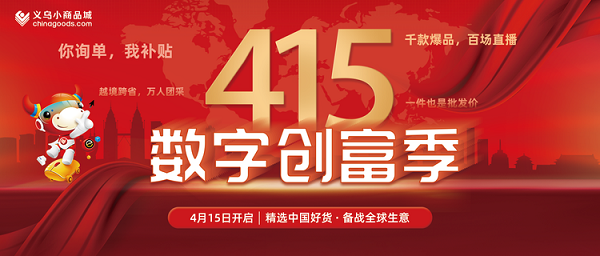 作为义乌市场创新发展的探索者和实践者,义乌小商品城聚焦数字化转型,抢抓国内国际双循环,自贸试验区等新机遇,于2021年4月15日举办首届415全球直采节,今年主题为415数字创富季,15谐音义乌,415谐音“是义乌”。