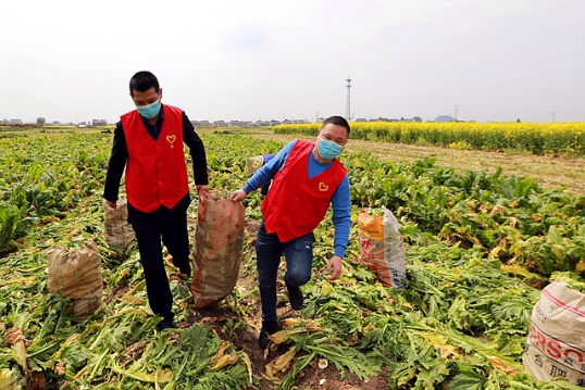 图为上虞区烟草专卖局志愿者帮助零售户收割榨菜