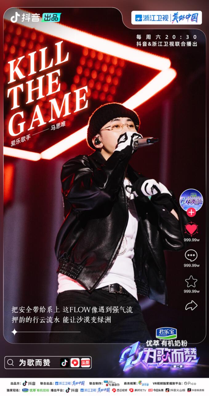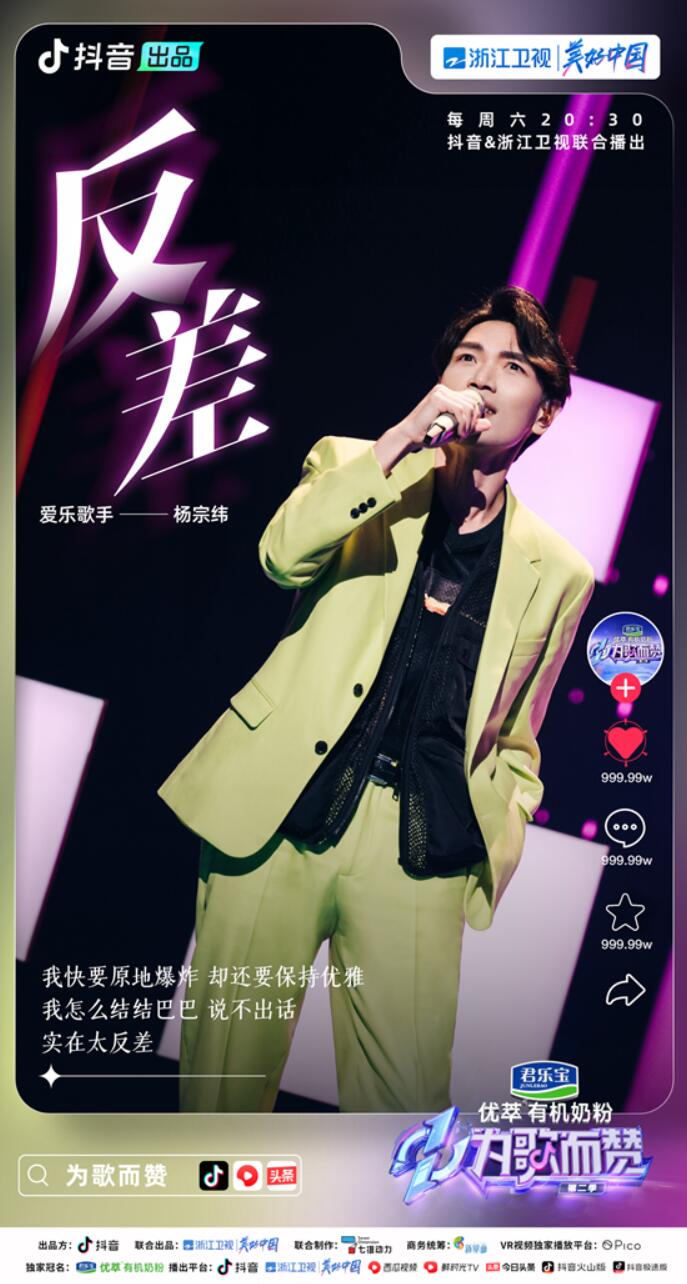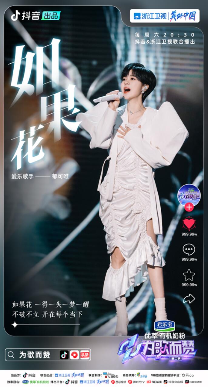 乐无正解,百赞成歌。“抖音热歌+新歌”的打歌舞台模式,一站式享受多种风格的音乐舞台,就在《为歌而赞》!君乐宝优萃有机奶粉《为歌而赞》第二季已于4月9日起,每周六20:30在抖音和浙江卫视播出,西瓜视频、鲜时光TV、今日头条、抖音火山版、抖音极速版联合播出。上抖音搜索“为歌而赞”,期待接下来更多精彩舞台的播出!
