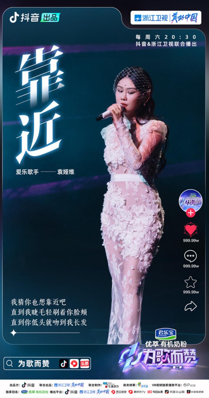 4月16日周六晚20:30,由抖音出品,抖音和浙江卫视联合播出的君乐宝优萃有机奶粉《为歌而赞》第二季迎来了第二期节目的播出,袁娅维翻唱的抖音热歌《靠近》收获89个音符,成为本期“百赞主打歌”。杨宗纬、郁可唯、马思唯、柳爽和王赫野也分别为“新歌阵营”和“热歌阵营”带来了精彩的音乐舞台,被观众戏称又收获了不少可以加入单曲循环列表的歌曲。