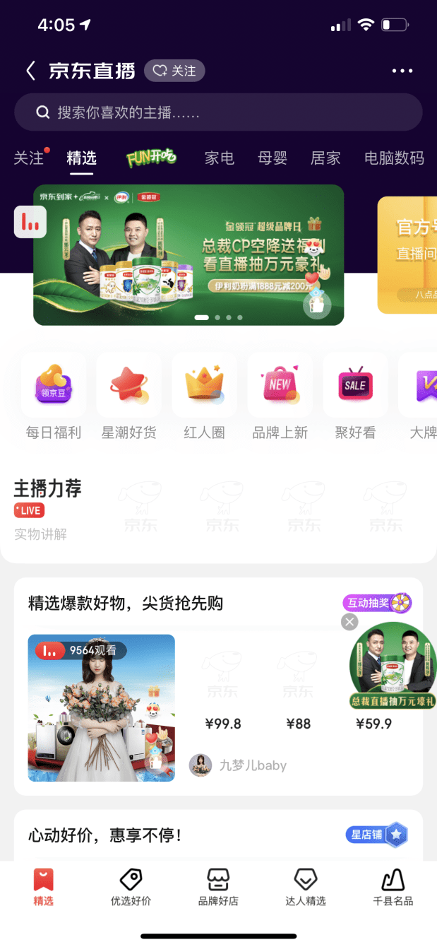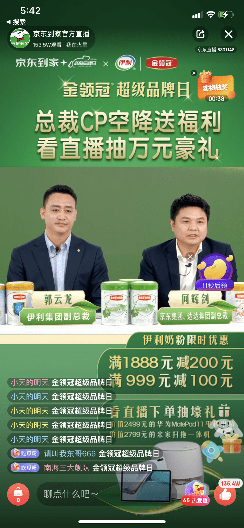 4月16日,在京东到家与伊利金领冠联合打造的“超级品牌日”直播活动中,伊利集团副总裁郭云龙和达达集团、京东集团副总裁何辉剑受邀组成“总裁CP”空降京东到家直播间,为观看直播的消费者们带来了巨大惊喜,也将本次京东到家415同城购物节活动推向了高潮。