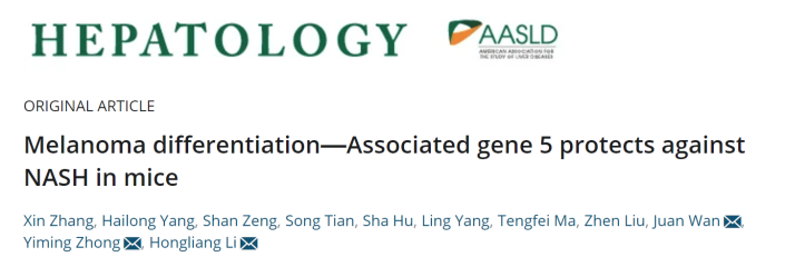 4月,李红良团队在Hepatology发表题为“Melanoma differentiation-Associated gene 5 protects against NASH in mice”的研究论文。该研究发现了黑色素瘤分化相关基因5(MDA5)在NASH发展中的作用,并且揭示了其核心分子机制,研究结果支持MDA5作为ASK1的重要调节因子,在 NASH的进展中发挥重要的调控作用,有望成为NASH药物开发的新靶点。