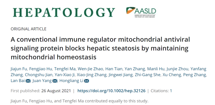 2月,李红良团队在Hepatology发表题为“A conventional immune regulator mitochondrial antiviral signaling protein blocks hepatic steatosis by maintaining mitochondrial homeostasis”的研究论文。研究发现,在肝细胞中,MAVS通过与电压依赖性阴离子通道2调节线粒体功能,在预防NAFLD方面发挥重要作用,并支持靶向MAVS有望成为代表治疗NAFLD的途径可能性。