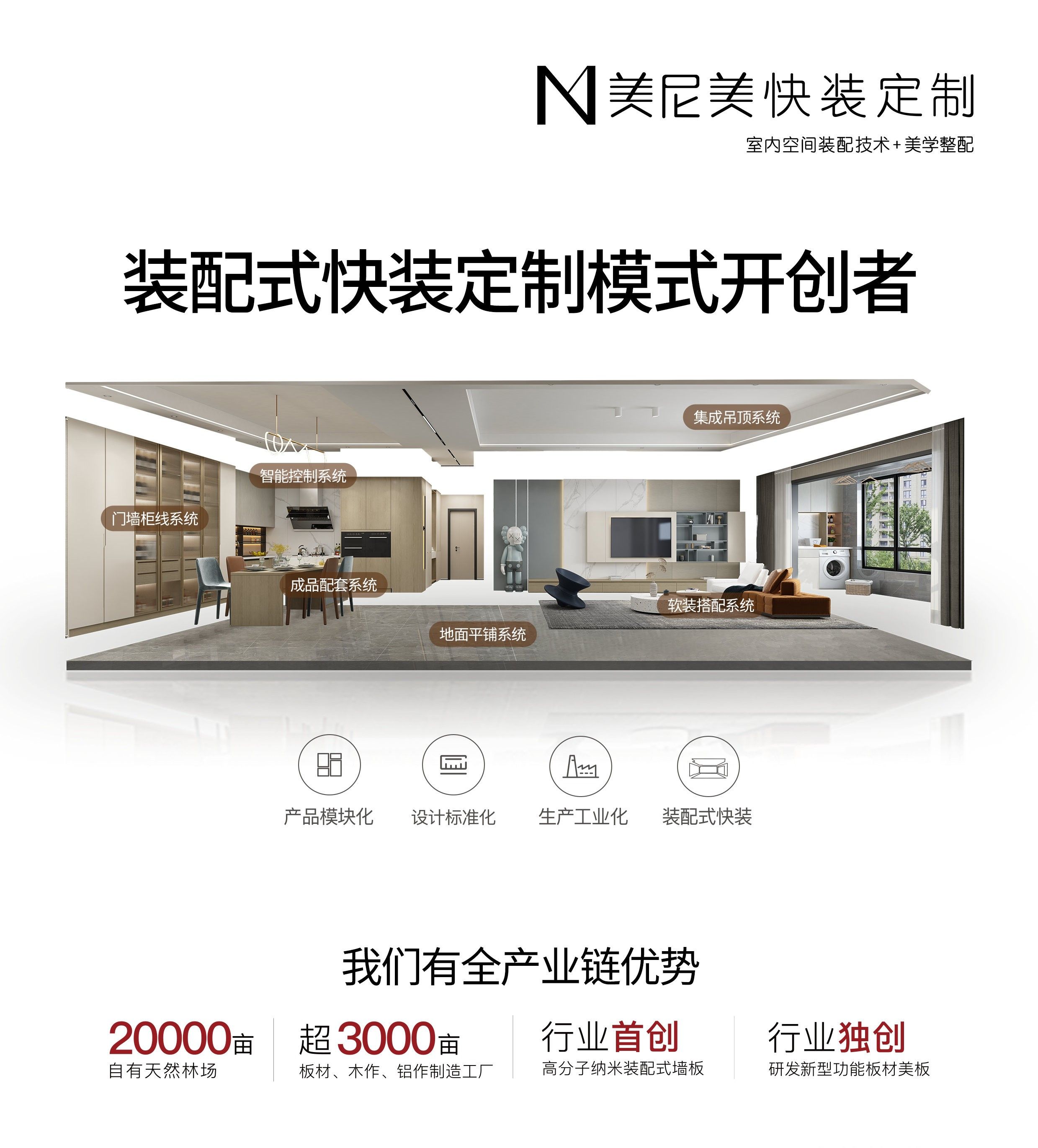 依托自营20000亩天然林场和超3000亩的板材制造、木作制造、铝作制造工厂的全产业链优势,美尼美快装定制以室内空间装配技术+美学整配为核心模式,构建五大风格六大系统十大空间产品体系,集成空间全品类,围绕颜值、品质、舒适、格调和服务等方面,打造一站式交付服务链条。