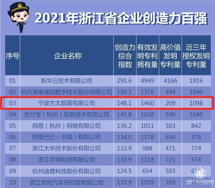 近日,浙江省市场监管局发布了省创造力百强企业榜单,以2021年底数据为基准对省内企业创造力进行评价排名,高端厨电领军品牌方太在一众互联网和高新技术企业中脱颖而出,以创造力综合指数148.1、有效发明专利拥有量1460件、高价值发明专利量209件、近三年授权发明专利量1098件的突出表现高居榜单第三,超过同期登榜的支付宝、网易和阿里巴巴、大华等。