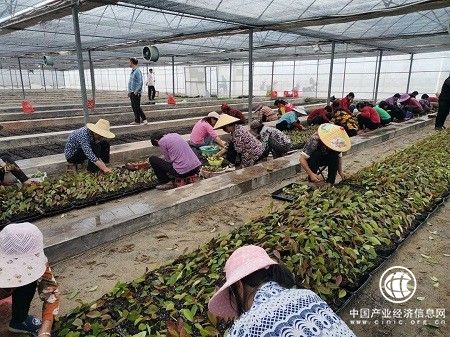 在位于安仁县安平镇樟桥村的闲置烟叶育苗大棚里,村民们正在忙着花卉育苗,或将新到的育苗容器卸车,或将幼苗移栽到容器里,一个个忙得热火朝天。