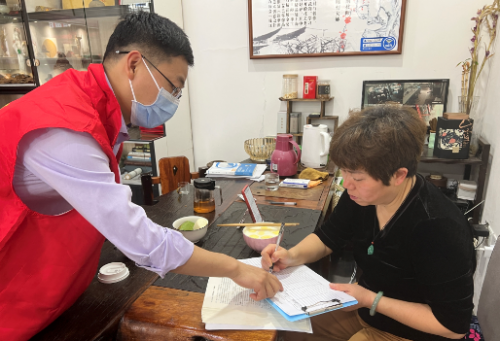 图为:浦江县烟草专卖局“香溢”青年志愿者协助社区入户登记店铺信息