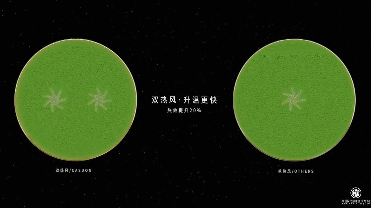 从上图可以窥探,双热风带来的并不是将一个风机的动能简单加倍,它采用的左顺右逆的旋转方式,与双风扇同顺时针的旋转方式相比,前者腔体中心升温速度提升17%左右。