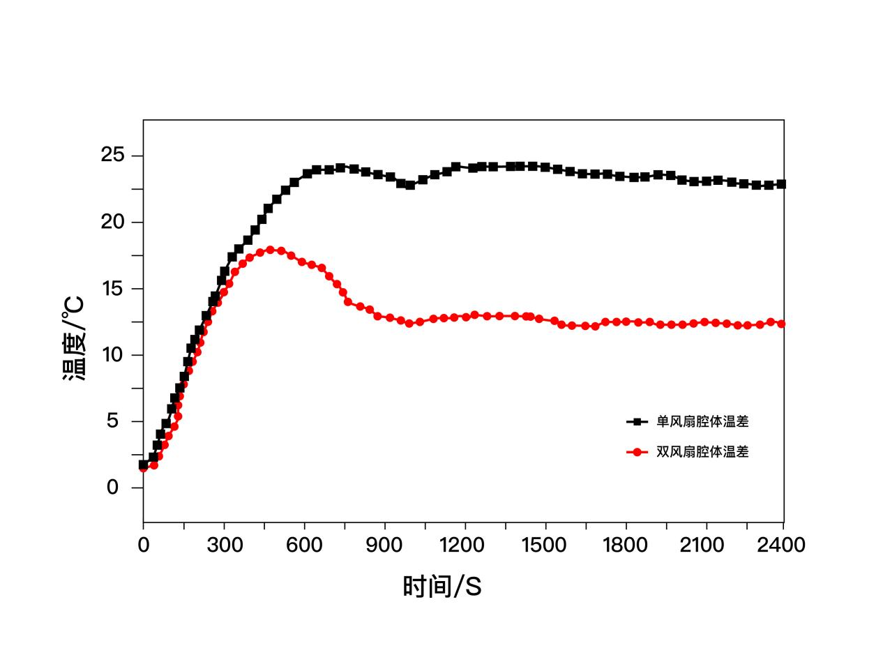 如上图所示,在同等条件下单热风的腔体测得最大温差24.8℃左右,稳定后的温差22.6℃左右,而双风扇对流腔体最大温差比单热风减小30.2%左右,稳定后的温差比单风扇降低45%左右。