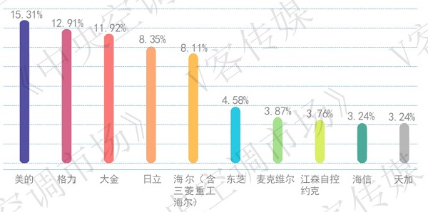 细分到品牌层面,美的以15.31%的市场份额领跑全球中央空调品牌,排在第一位,格力、大金、日立、海尔、东芝等品牌位居其后。从品牌差距来看,高居榜首的美的中央空调市场份额呈明显领先优势。