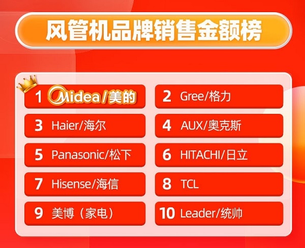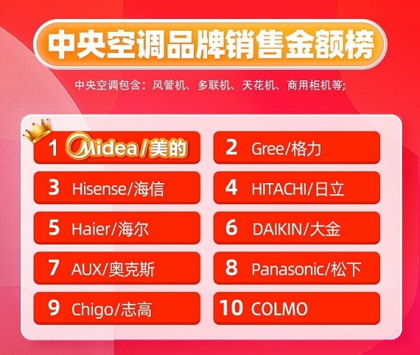 根据天猫消费电子集成家电行业排行榜4月榜单显示,在“中央空调品牌”与“风管机品牌”销售金额榜榜单上,美的中央空调摘得“双冠”,成为了最受中国消费者青睐的中央空调品牌。