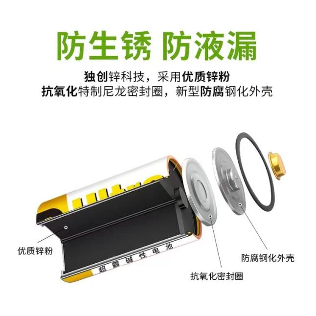 GP超霸碱性电池蕴含独有的锌科技,其电量相较于普通碳性电池要高出10倍以上,在电动玩具模拟放电模式与电子游戏机模拟放电模式下,采用优质锌粉的“续能芯”放电时间都比国标标准值要高48%,存放1-2年后仍有80%左右的电量,电池有效期长达7年。且电池从内到外都使用抗氧化防腐材料,可以有效防生锈防漏液,电池使用寿命更长。