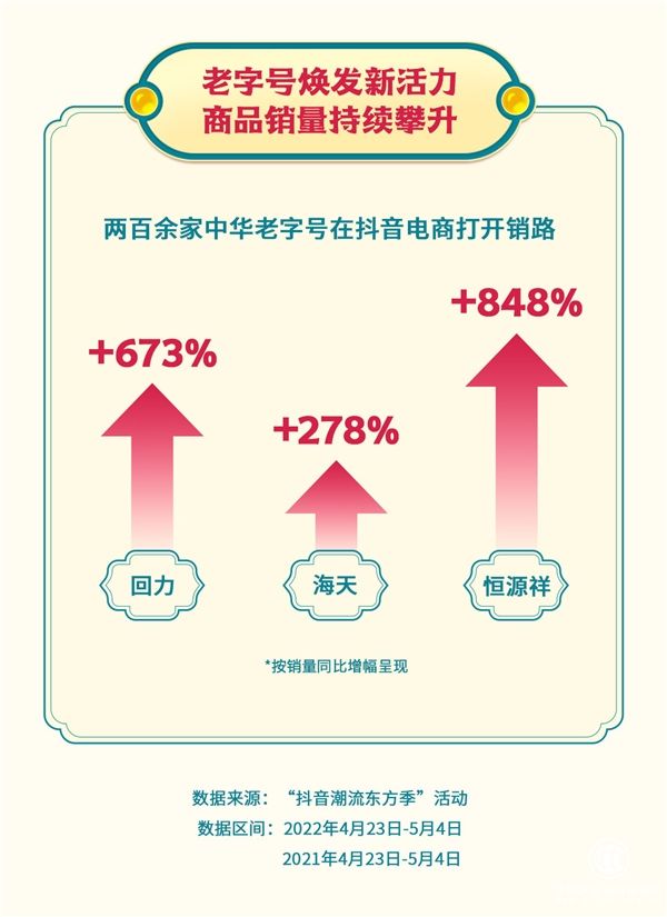 随着国货消费需求不断升级,传统老字号也在传承与创新中变身“新国潮”。据悉,已有两百余家中华老字号通过抖音电商打开了新销路。在“抖音潮流东方季”活动推动下,回力、海天、恒源祥销量成倍数增长,同比增幅达673%、278%和848%。