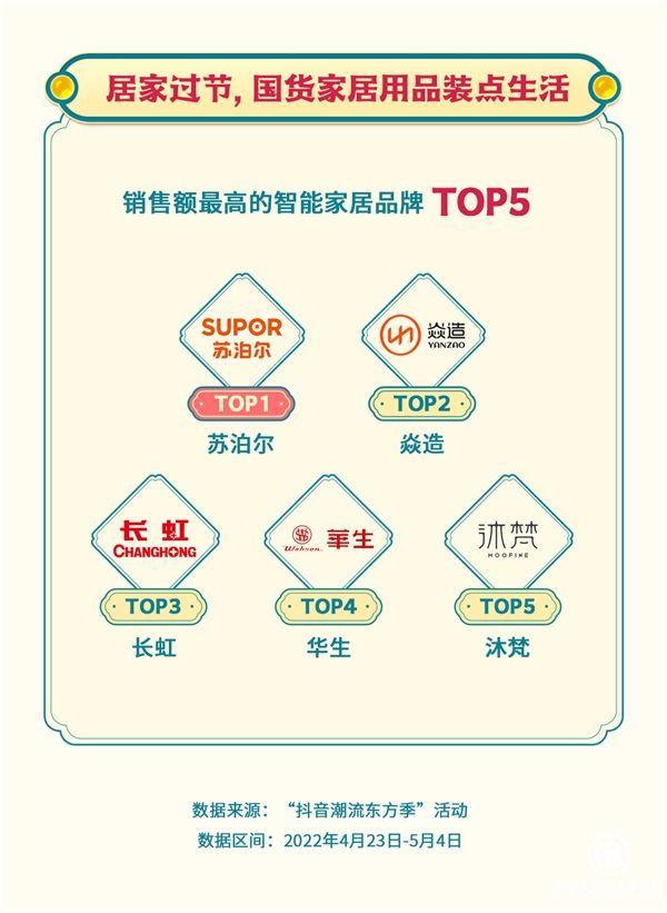 “抖音潮流东方季”活动正值五一假期,大众对智能家居用品消费热情高涨。家用多功能锅、电风扇、家纺用品等成为装点美好生活的潮品。苏泊尔、焱造、长虹、华生和沐梵等智能家居品牌销售火热,整体销售额位居前列。