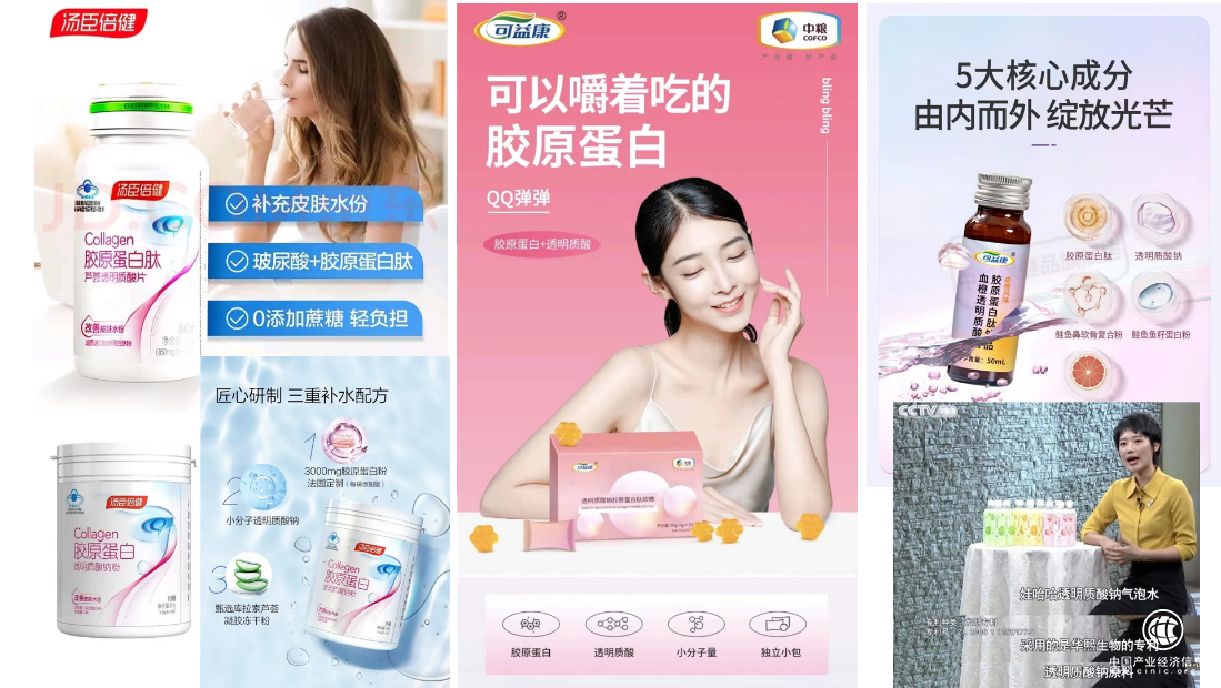 玻尿酸入食一年多以来,不断有大品牌参与到玻尿酸新品的打造,涌现了玻尿酸软糖、气泡水、饮用水、酸奶等多个功能性食品品类。70余年历史的央企中粮旗下品牌可益康推出血橙透明质酸钠胶原蛋白肽饮品,以 “国家队”身份站位口服玻尿酸,主打玻尿酸补水与胶原蛋白抗衰的复合功效;此外百年“老字号”品牌娃哈哈去年也积极试水,其科学添加了华熙玻尿酸的透明质酸钠气泡水曾现身央视《国货之光》栏目,以突出的产品力获赞,在大众视野内展示了一次分量足够的“出圈”;保健品巨头汤臣倍健新近推出的胶原蛋白透明质酸粉、胶原蛋白肽芦荟透明质酸片等科学营养产品则拥有“蓝帽子”标识,其改善皮肤水分的功效受官方检测机构权威认证……
