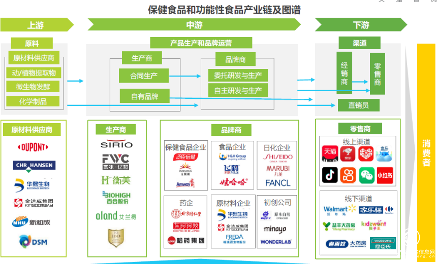 功能性食品产业链条上,上游原料端的参与者主要有动植物提取物、生物发酵、化学提取物等企业,属于技术、资金、商业环节壁垒较高的环节。一款新型功能性原料在应用到消费市场前,需经过长时间的基础研究和临床实验及数据验证,此外还需通过国家相应的行政审批,获得审批后,才可以在相应的产品类别中进行商业化应用。