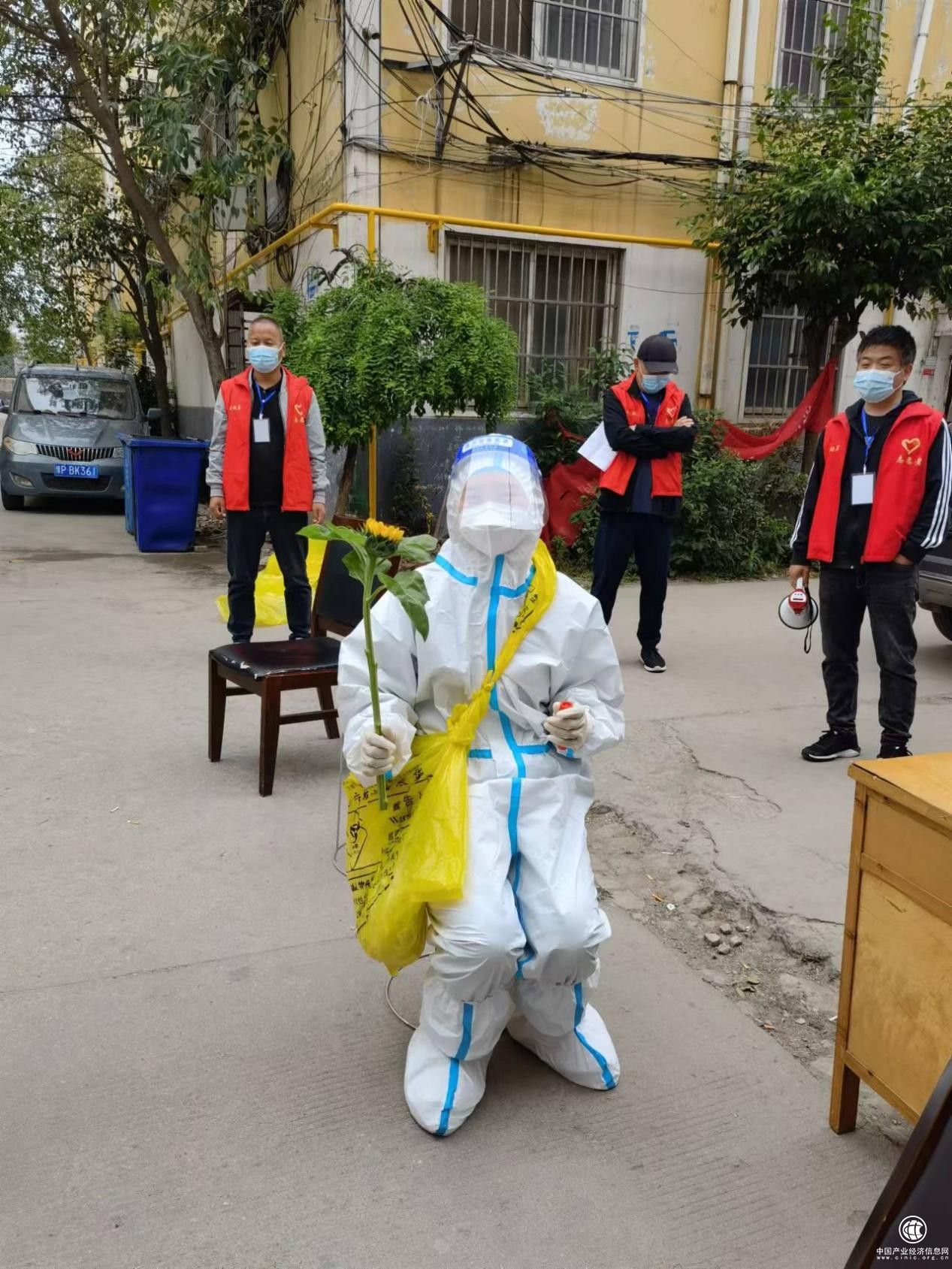 注:5月8号母亲节,在项城市东方社区核酸检测现场,来自周口市中医院医疗援助的“美丽大白”工余收到了一支表达母亲节祝福的向日葵花,被同时在此帮扶的项城市烟草专卖局的志愿者拍下了此刻的温馨画面,笔者看后有感而发。(文:王彦峰 图:李延斌)