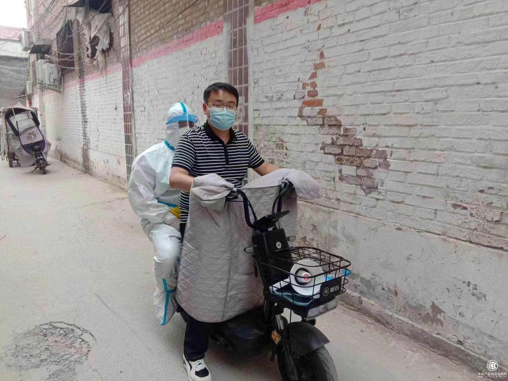 党员赵振亚骑车带着医务工作人员在鹿邑县红星社区入户开展核酸样本采集