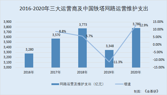 根据上市公司年报,三大运营商及中国铁塔在网络运营及维护上投入逐年增加,由2016年的3,280亿元增长至2020年的3,780亿元,年均复合增长率达3.6%。