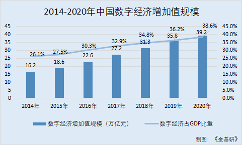 2020年,国内产业数字化增加值约为31.7万亿元,占GDP比重为31.2%,其中服务业、工业数字经济渗透率分别为40.7%及21%。