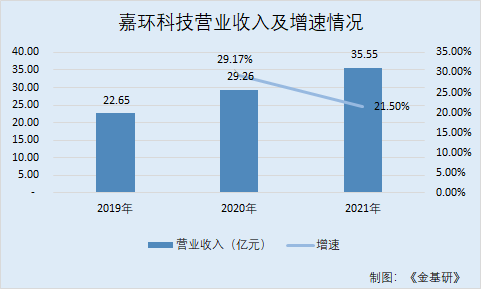 2019-2021年,嘉环科技营业收入分别为22.65亿元、29.26亿元、35.55亿元,2020-2021年分别同比增长29.17%、21.5%。