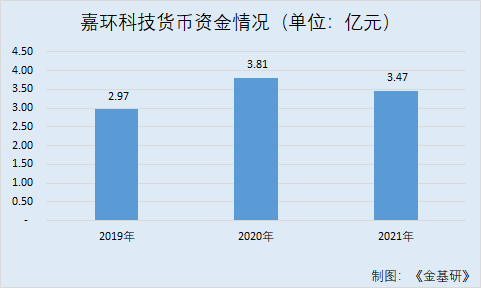 此外,嘉环科技的货币资金保持充足,2019-2021年,其货币资金分别为2.97亿元、3.81亿元、3.47亿元。