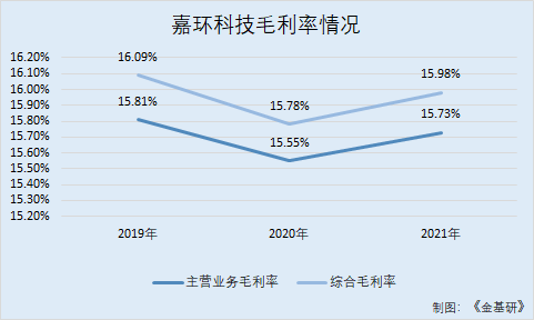 2019-2021年,嘉环科技的综合毛利率分别为 16.09%、15.78%和15.98%,其中,主营业务毛利率分别为 15.81%、15.55%和 15.73%,基本保持稳定。