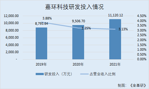 2019-2021年,嘉环科技的研发投入分别为8,793.64万元、9,506.7万元、11,120.12万元。同期,研发投入占营业收入的比例分别为3.88%、3.25%、3.13%。