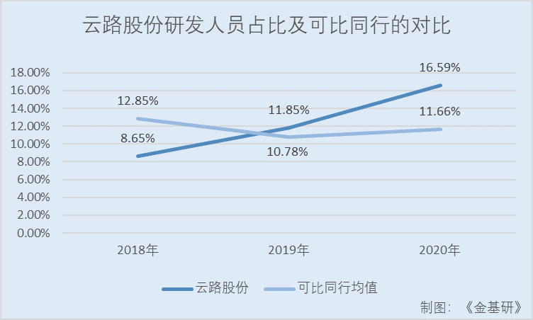 2018-2021年,云路股份研发人员占比分别为8.65%、11.85%、16.59%、20%;2018-2020年,同行业可比公司安泰科技、扬电科技、铂科新材及横店东磁研发人员占比的均值分别为12.85%、10.78%、11.66%。
