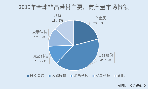 根据QY Research的统计数据,2019年全球非晶带材主要厂商有日立金属、云路股份、兆晶科技、安泰科技、其他厂商,产量分别占市场的份额为20.96%、41.15%、12.22%、12.25%、13.42%。