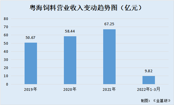 2019-2021年及2022年1-3月,粤海饲料分别实现营业收入50.67亿元、58.44亿元、67.25亿元、9.82亿元,2020-2021年及2022年1-3月分别同比增长15.34%、15.08%、28.79%。